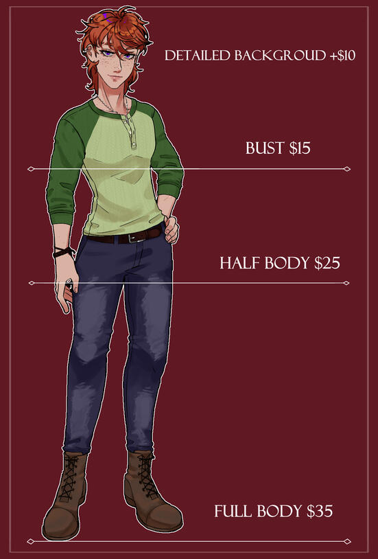 An extra $10 will be charged for detailed/complex background. All illustrations will have a simple background by default!